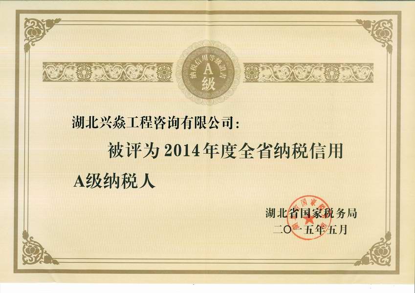 2015年5月,湖北兴焱工程咨询有限公司被湖北省国家税务局评为2014年度全省纳税信用A级纳税人!