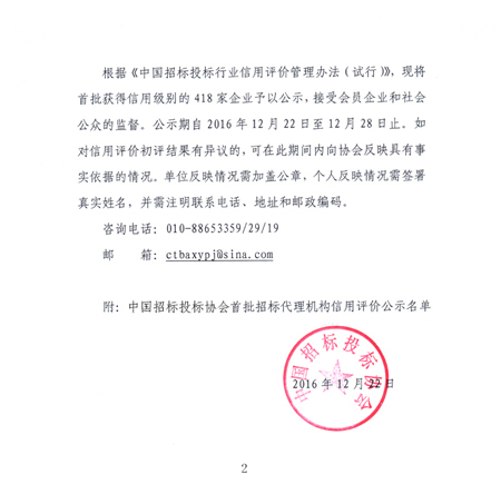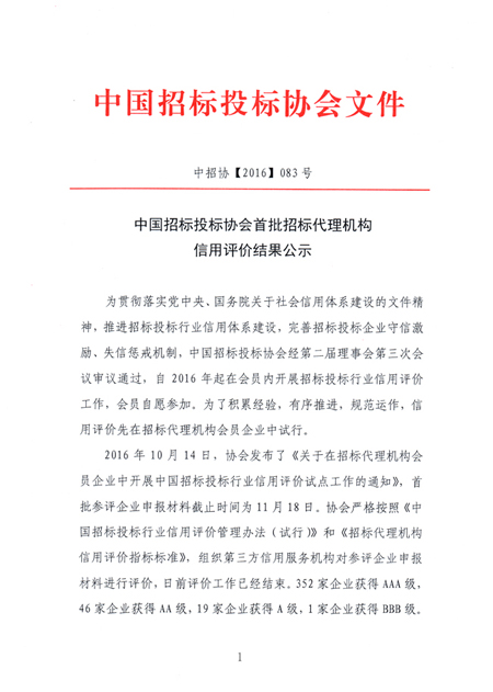 中国招标投标协会首批(AAA)招标代理机构信用评价公示名单