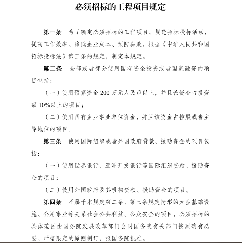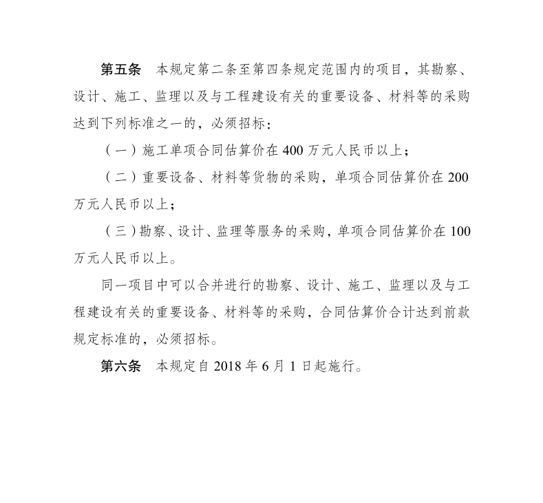 《必须招标的工程项目规定》已经国务院批准,现予公布,自2018年6月1日起施行。