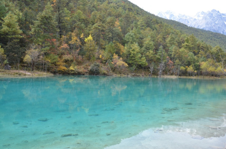 蓝月谷满眼碧水,如一匹巨大的蓝色绸缎从天上悄无声息地落在静谧的山间,山倒影在湖里,静谧如神境。